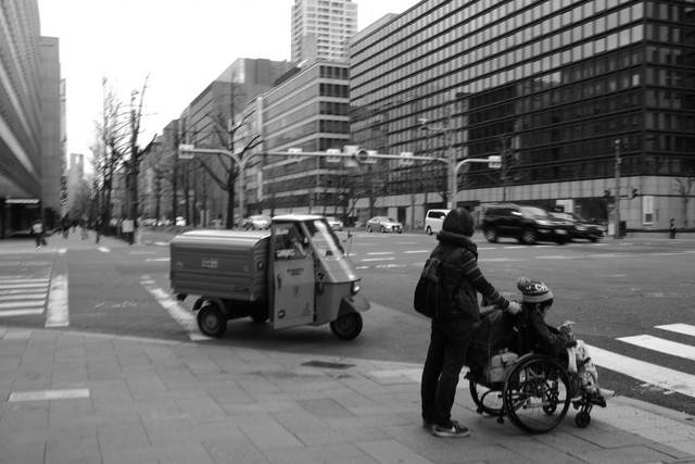 (レトロな車と、車椅子の雰囲気が、モノクロかなあ~と思って撮りました。X-Pro1 XF23mm)